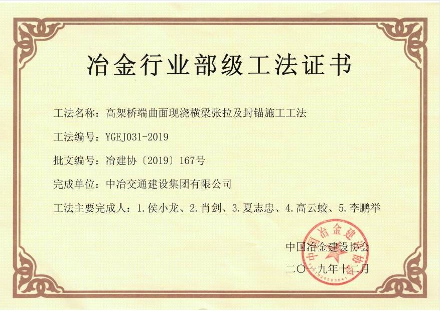 2019年高架桥端曲面现浇横梁张拉及封锚施工工法证书
