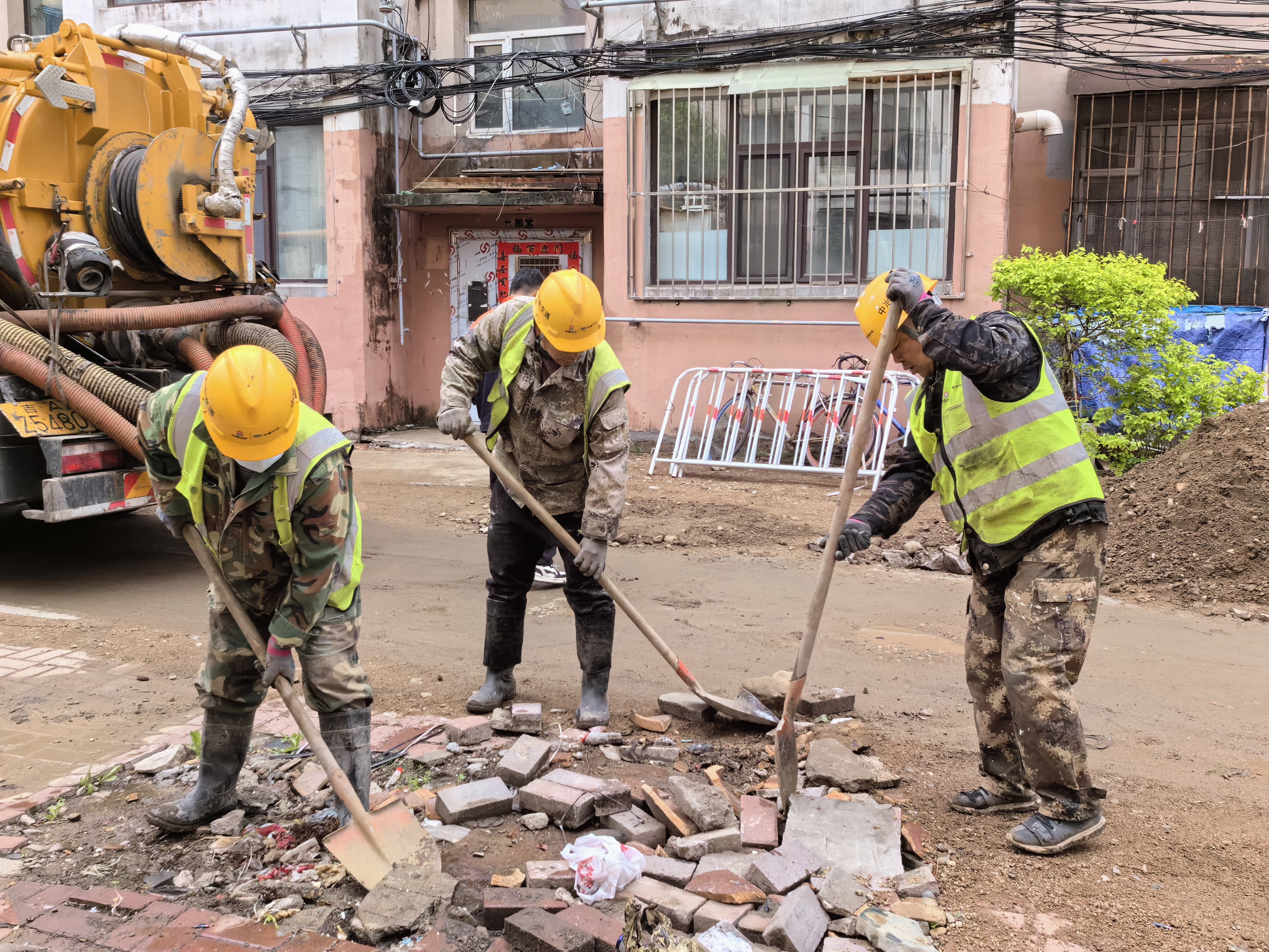 为此,老旧小区改造项目部迅速响应,制定了“三步走”方案:一是清理围挡杂物:四工区骨干对化粪池上堆积的杂物进行人工清理;二是紧急吸污清淤:调用专业设备抽吸池内积存多年的污物;三是混江砂回填修复:用质量合格的混江砂回填塌陷区域。经过一天的处理,曾经异味弥漫、出行受阻的“闹心地”焕然一新,居民们纷纷为这场“民生速办”行动点赞。