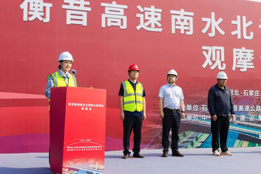 吴国洪在致辞中对支持和帮助项目建设发展的各级政府及相关单位表示感谢,并向所有一线建设者致以崇高的敬意。她表示,衡昔高速公路是河北省“十四五”规划的重点民生工程。作为施工单位,中国五矿、中国中冶、中冶交通始终坚持“生态优先、绿色发展”,在“加快建设交通强国”中勇当先锋,充分发挥在绿色施工、技术创新等方面的专业优势,由数百名各类专业工程师经过17个月的不懈努力,最终优质高效完成了全国首座跨越南水北调干渠且结构形式复杂的矮塔斜拉转体特大桥施工任务。未来,公司将继续在石家庄市委市政府、市交投、市高速集团、市衡昔高速公路建设管理有限公司等各级政府和单位的大力支持下,积极融入地方经济发展,在民生保障、生态保护、“双碳”建设、重大基础设施、城市更新等领域,为加快建设现代化、国际化美丽省会城市贡献中冶智慧。同时项目管理团队也会以此次顺利转体作为新起点,按照施工要求精心组织,进一步振奋精神,全力冲刺,力争早日完成衡昔高速项目的全线贯通。